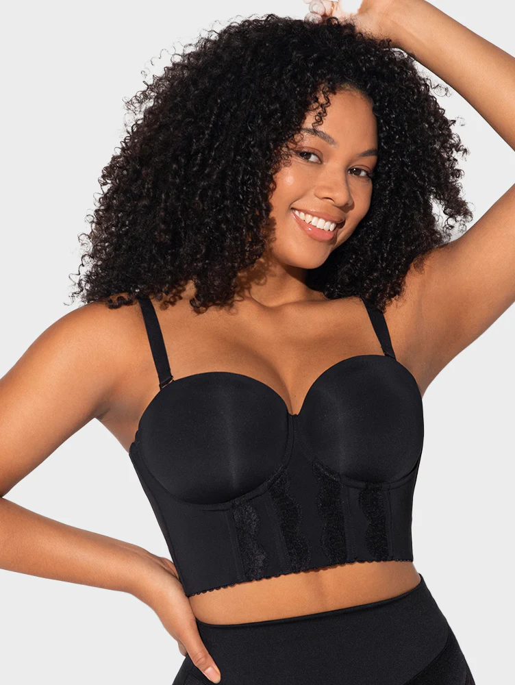 Este sutiã tomara que caia com cobertura nas costas e abaixo dos braços, permanece firme no lugar, mesmo com movimentos intensos, graças à sua faixa ajustada e estrutura de suporte.