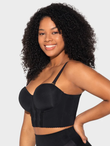 As alças removíveis oferecem versatilidade, e o design com costas baixas garante uma silhueta elegante.